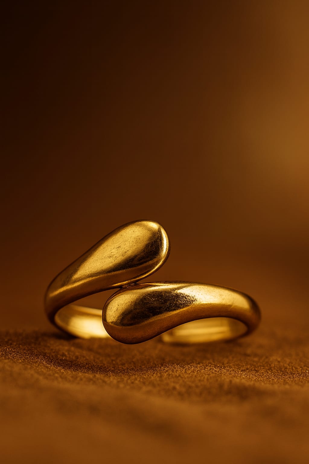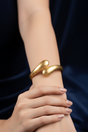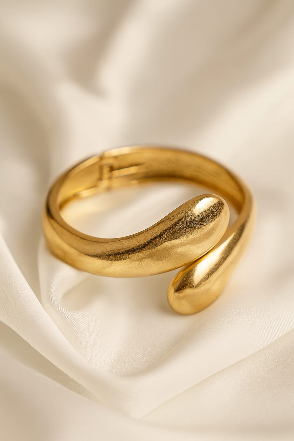 Elegant bracelet crafted from plated metal with a distinctive modern design. Composed of two teardrop-shaped pieces seamlessly connected. The bracelet features a shiny gold color.
