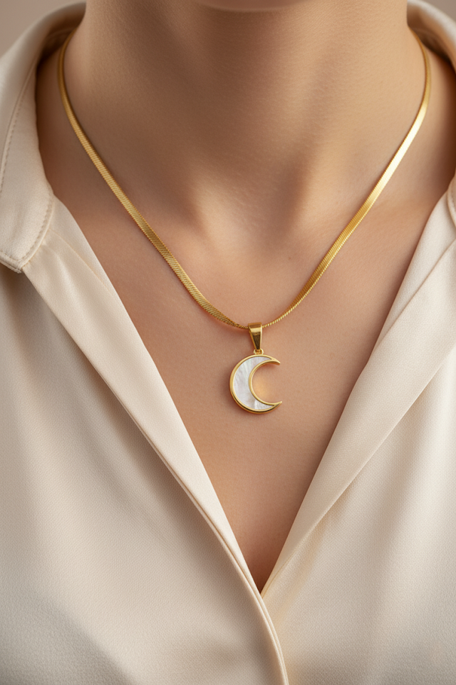 An elegant gold-tone stainless steel necklace, featuring a flat herringbone chain and a crescent moon pendant with a mother-of-pearl inlay. It adds a sophisticated touch to your everyday outfits and can be worn solo or layered. Its minimalist design makes it a thoughtful gift for various occasions.