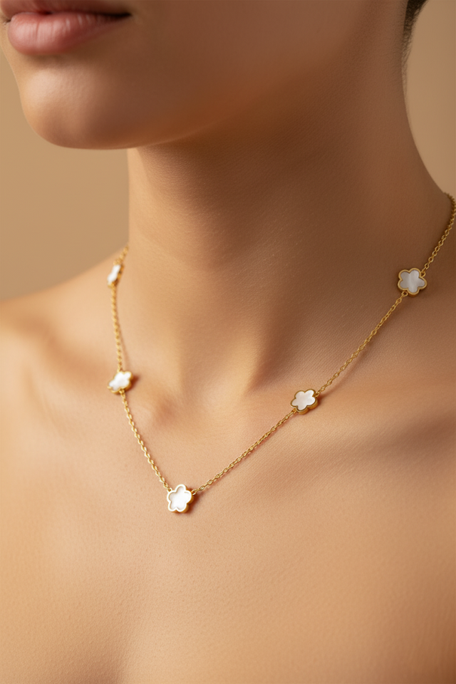 This women's necklace is crafted from stainless steel with a gold-tone finish, featuring small, evenly spaced white flower charms. It can be styled for a light everyday look or paired with office wear to add a subtle elegant touch. Makes a thoughtful gift for friends or for various special occasions.