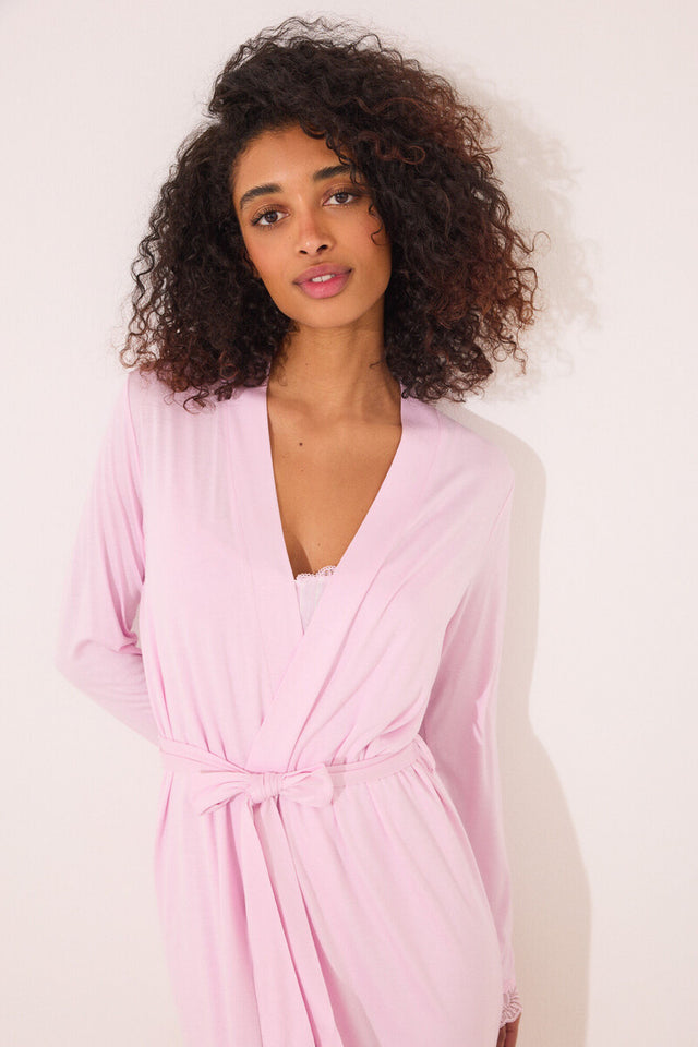 Long-sleeved midi robe in pink, made of super soft ECOVERO viscose fabric. Ideal to wear with a nightgown: it's the perfect outfit. - Belted for a better fit and lace detail at the hem. - Combines with other garments and accessories from the collection. - LENZING™ ECOVERO™ fibres are sourced from sustainable wood and cellulose, from certified and controlled sources. Model height: 175 cm. | She wears size S. Ref. 4359711 Composition and care Composition 95% viscose, 5% elastane Care Maximum washing temperature 30C. Short spin Do not bleach Do not tumble dry Gentle ironing Do not dry clean