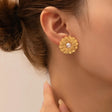Elegant flower-shaped earrings adorned with a shiny white pearl. Made from high-quality stainless steel.