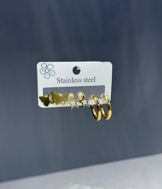 Shine with elegance with our stunning stainless steel earring set! This set includes three exquisite designs: two delicate butterflies, two sparkling stars, and chic hoop earrings. This set is a perfect elegant gift for yourself or loved ones, suitable for all occasions, from daily outings to special events. Enjoy a modern and chic look with this lightweight and durable set, ideal for adding a touch of elegance to your style. Order now and enjoy an exceptional shopping experience!