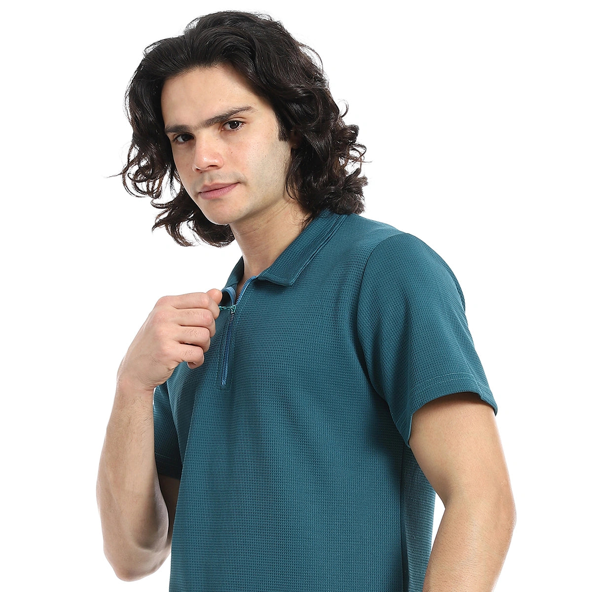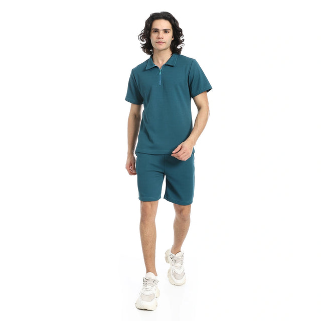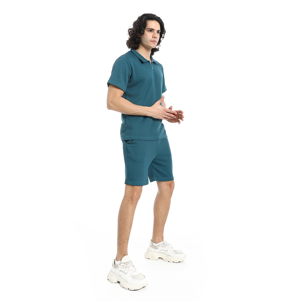 طقم تي شيرت وسروال قصير بسحاب بياقة مطوية باللون الأزرق المخضر - للرجال
