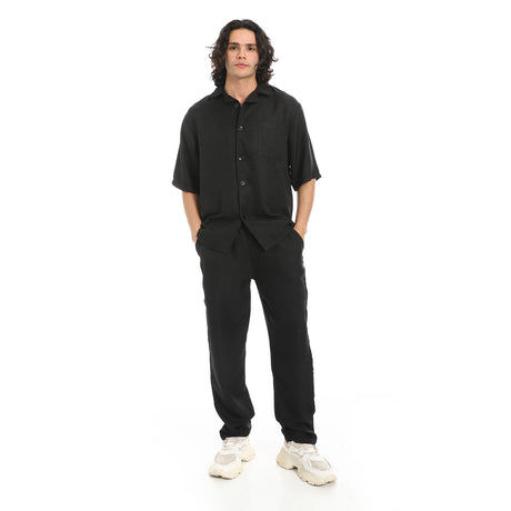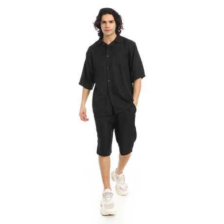 ريد سيركل - طقم تي شيرت وسروال قصير بياقة مطوية باللون الأسود للرجال