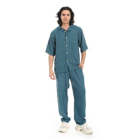 طقم تي شيرت وسروال قصير بسحاب بياقة مطوية باللون الأزرق المخضر - للرجال
