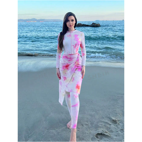Shein - Mulvari Women's Long Sleeve Burkini Set Contrast Floral Design Summer Beach Cover Up Skirt