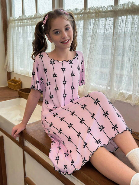 Shein - Tween Girls Pink Knitted Fabric Pajamas Featuring A Comfortable Scoop Neck And Short Sleeves