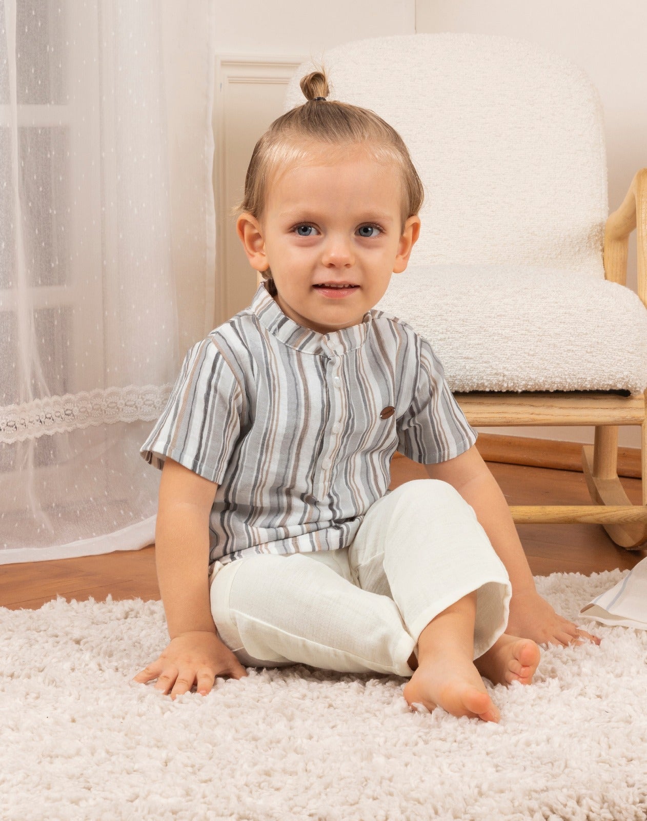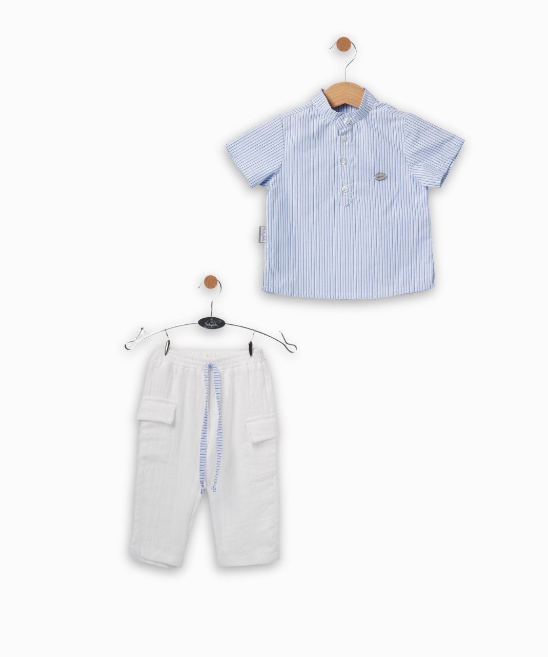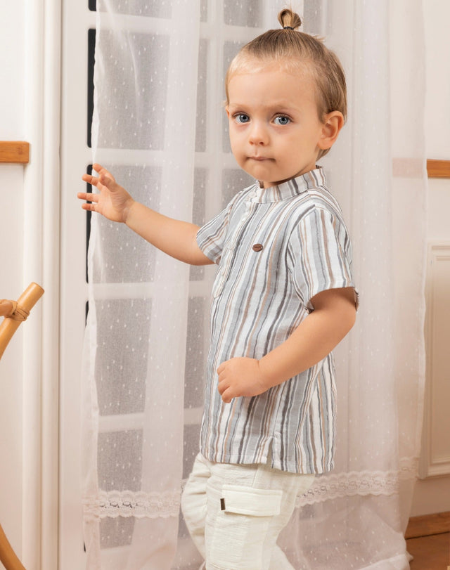 Give your little one a stylish and comfortable look with this adorable set, designed with a sophisticated yet practical style! The set consists of a short-sleeved shirt in light blue with fine white stripes that add a lively touch, along with a distinctive Chinese collar and partial buttons that reflect a sophisticated taste. The white pants feature an elastic waistband for ultimate comfort and a stylish drawstring that matches the shirt design. They also feature two side flap pockets for a practical touch. This set combines elegance and comfort, making it the perfect choice for any occasion.