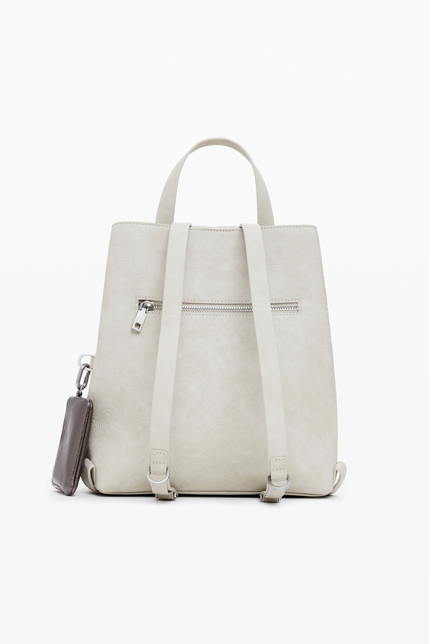 100% POLYURETHANE - Medium faux leather backpack with engravings made up of multiple square patches, featuring metallic stud finish and detachable metallic faux leather coin purse keychain.
