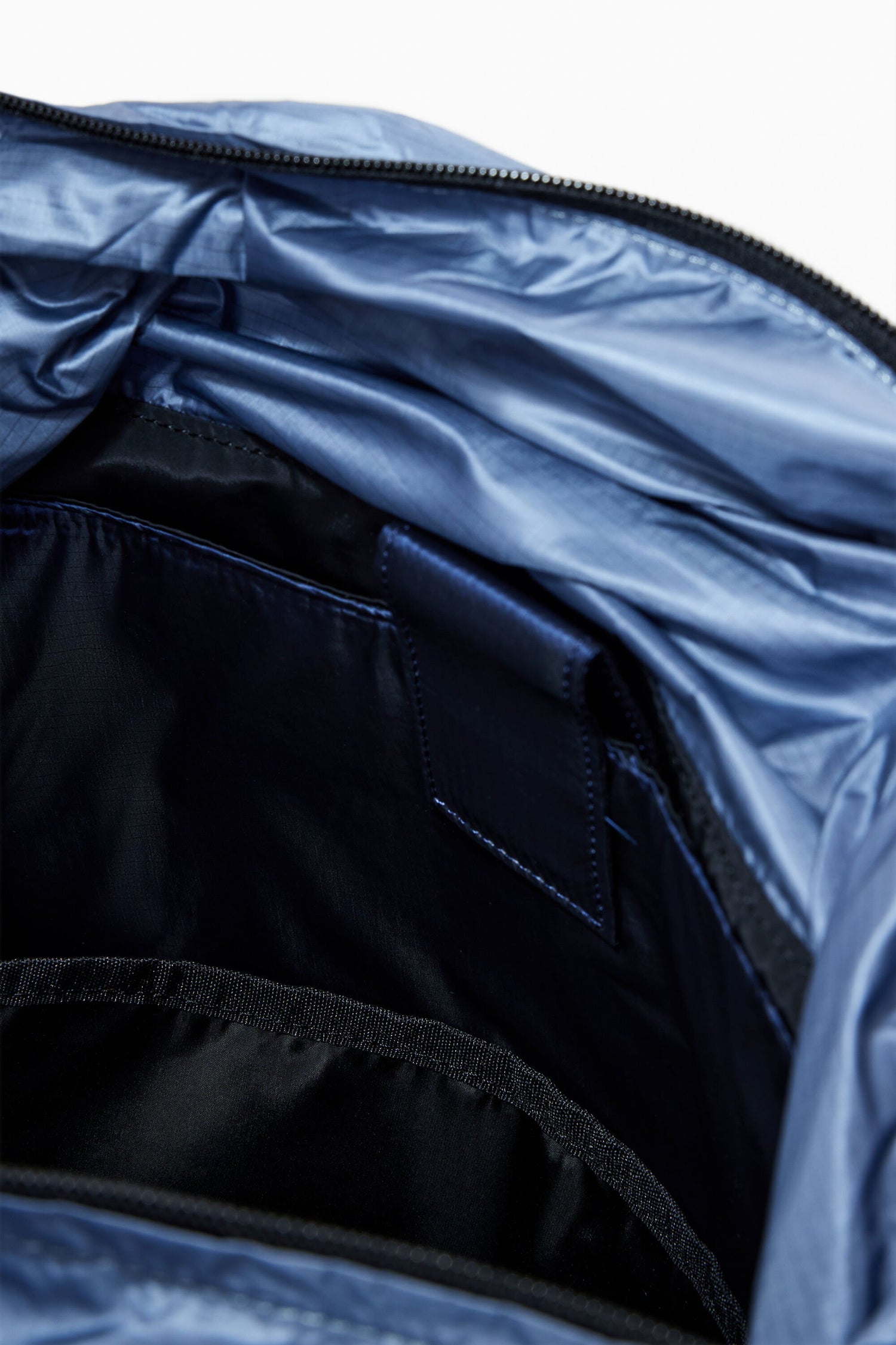 Large modular nylon backpack with handles convertible to tote bag, expandable, with bottom compartment and multiple pockets.