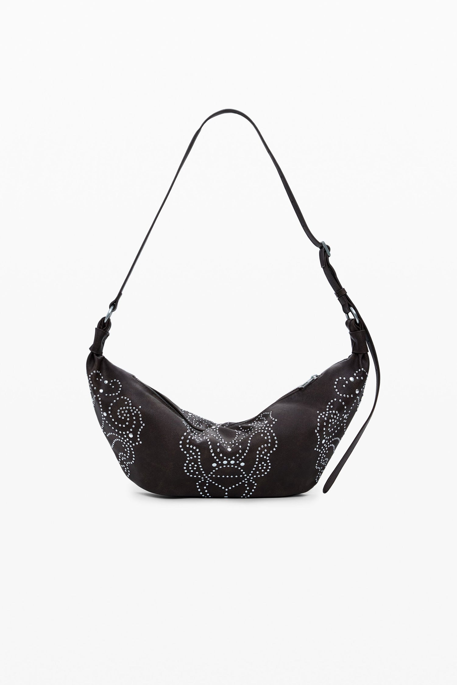 100% POLYURETHANE - Banana-shaped handbag in faux leather fabric, with metal stud details, zipper closure, and adjustable strap.