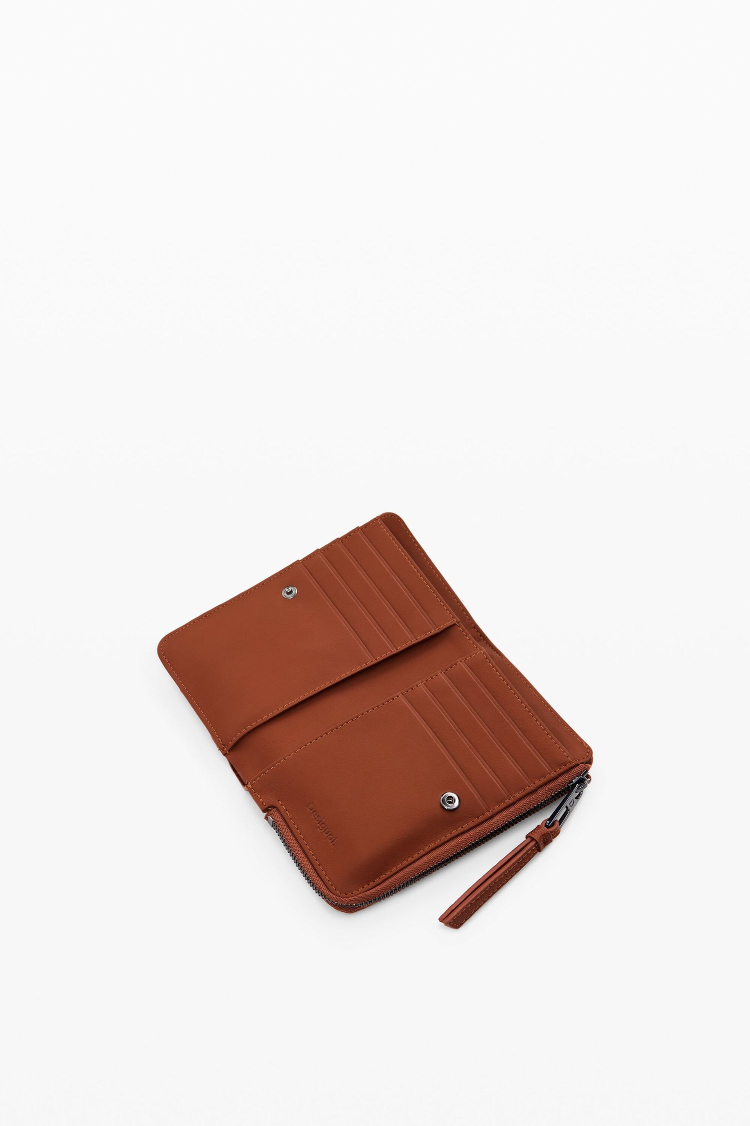 Medium perforated wallet with borders, metallic appliqués, zippers, various compartments, and card slots.