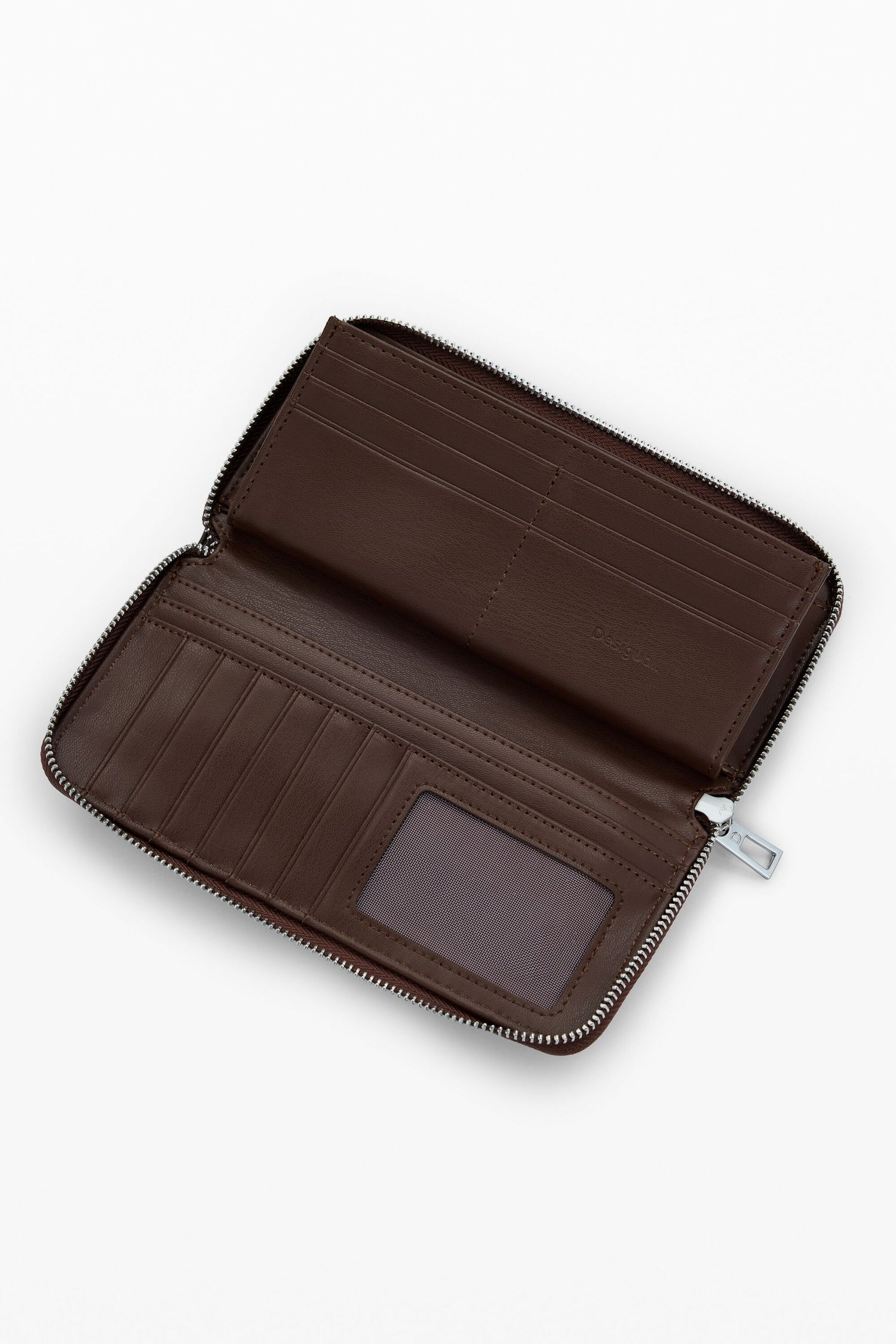 100% POLYURETHANE - Medium faux leather wallet with decorative stitching, strap with metal buckle, various compartments, and zipper closure.