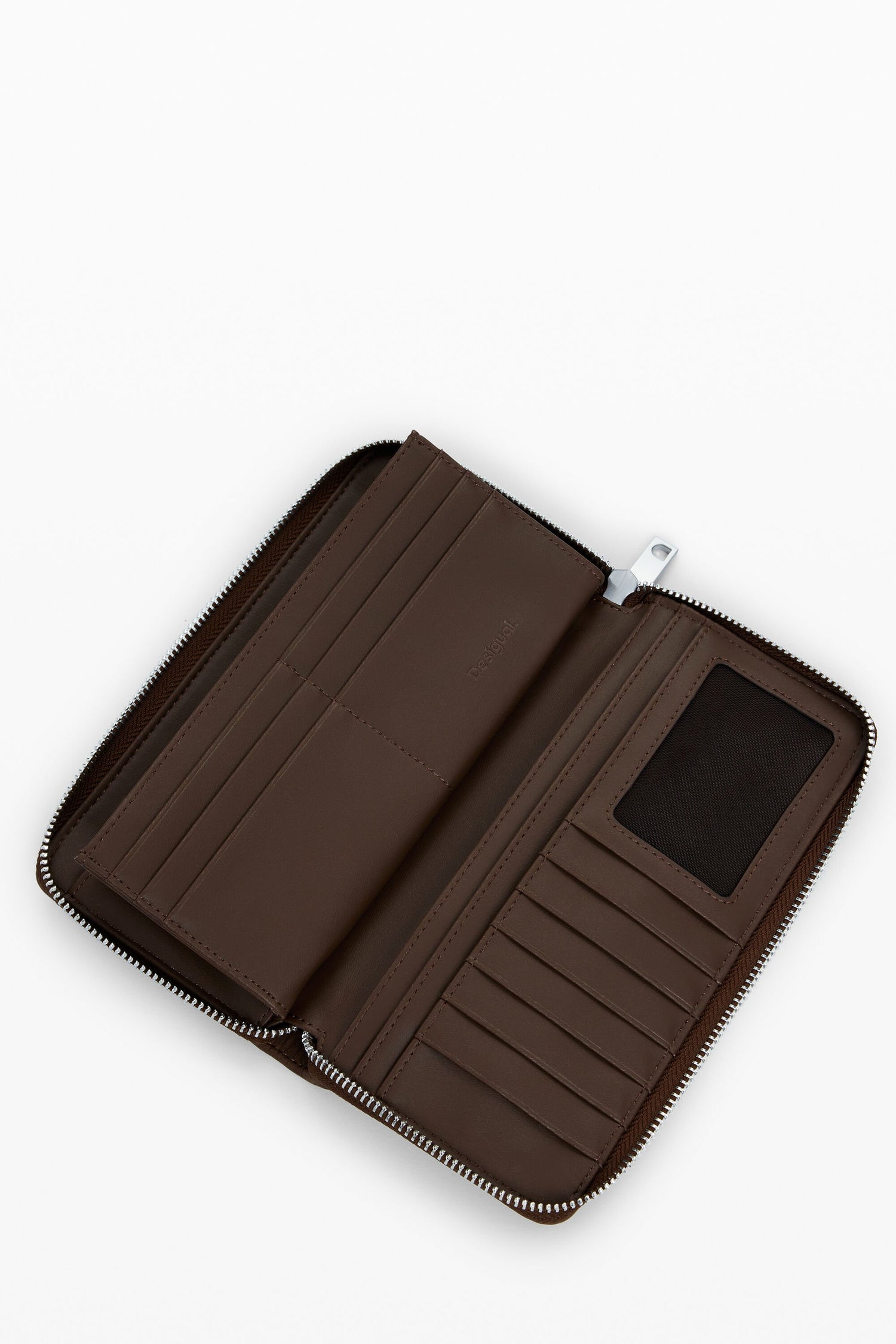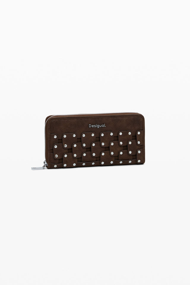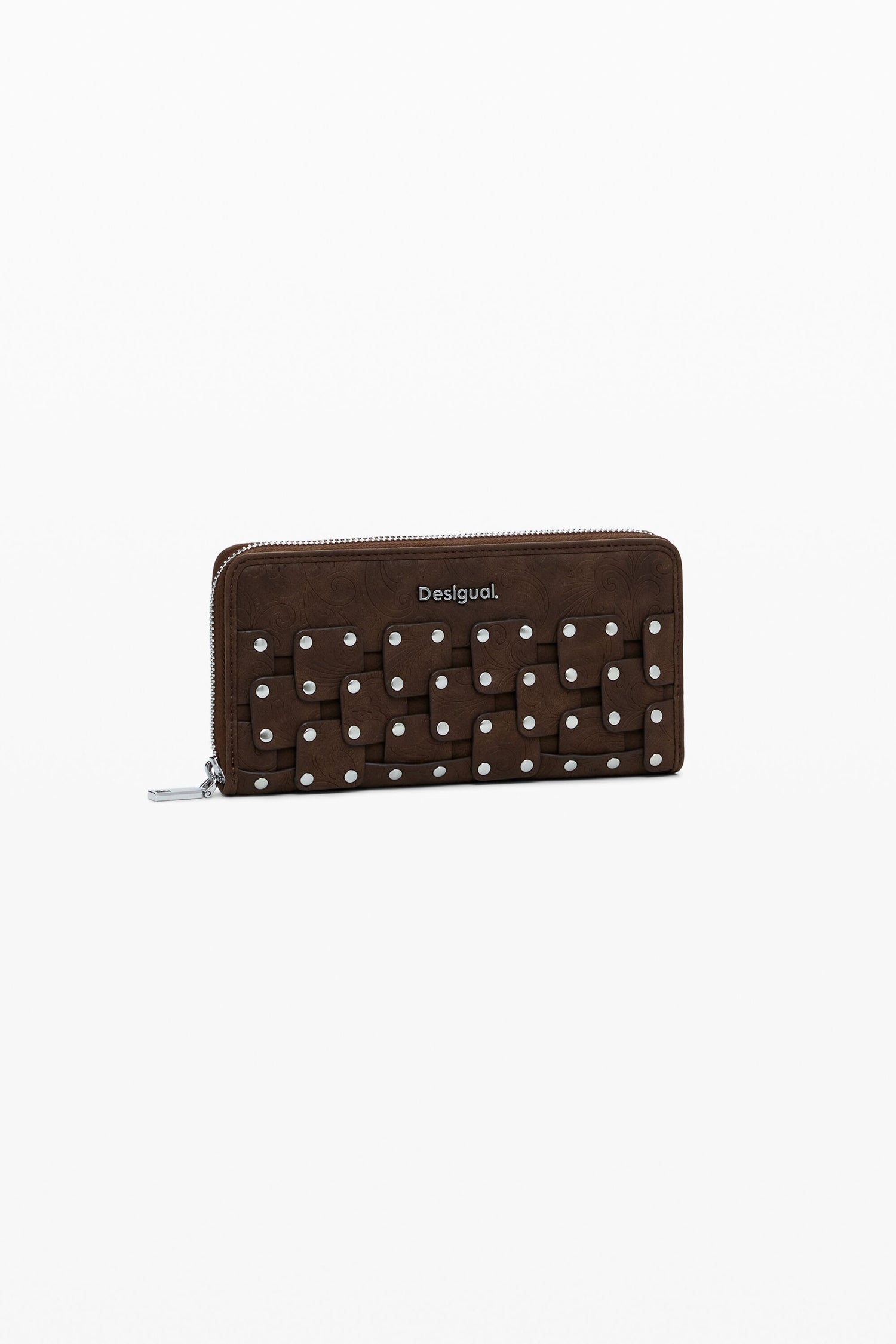 100% POLYESTER - Large elongated wallet, in faux leather fabric, with studs and patchwork effect, zipper closure, and various interior compartments.