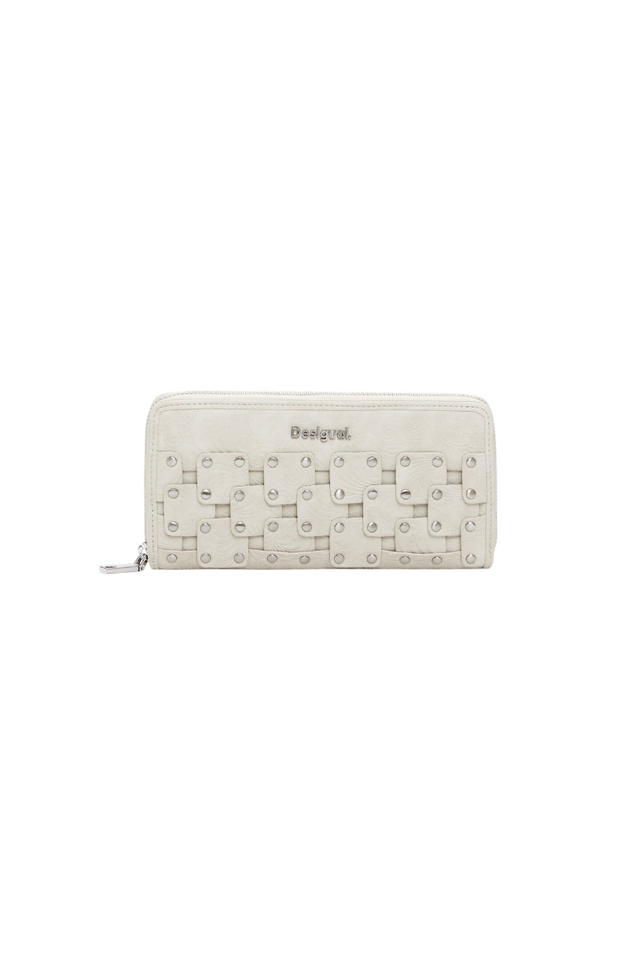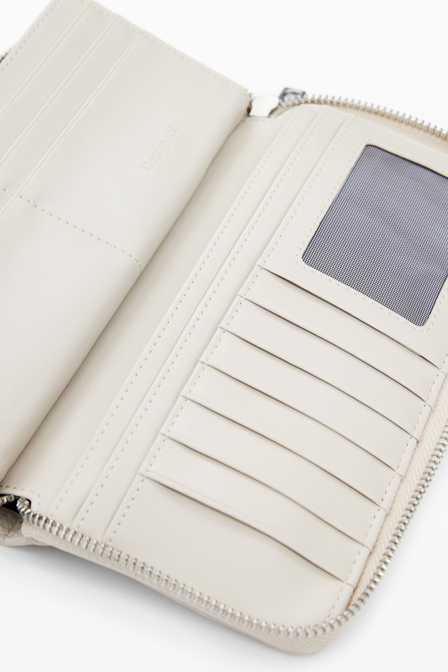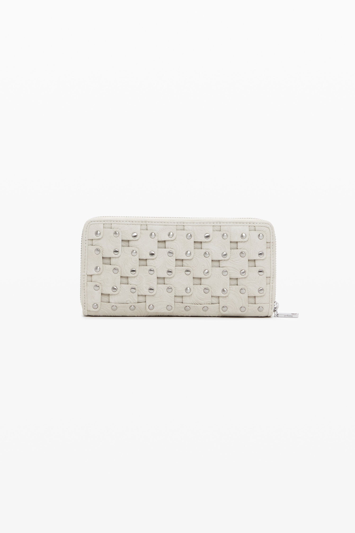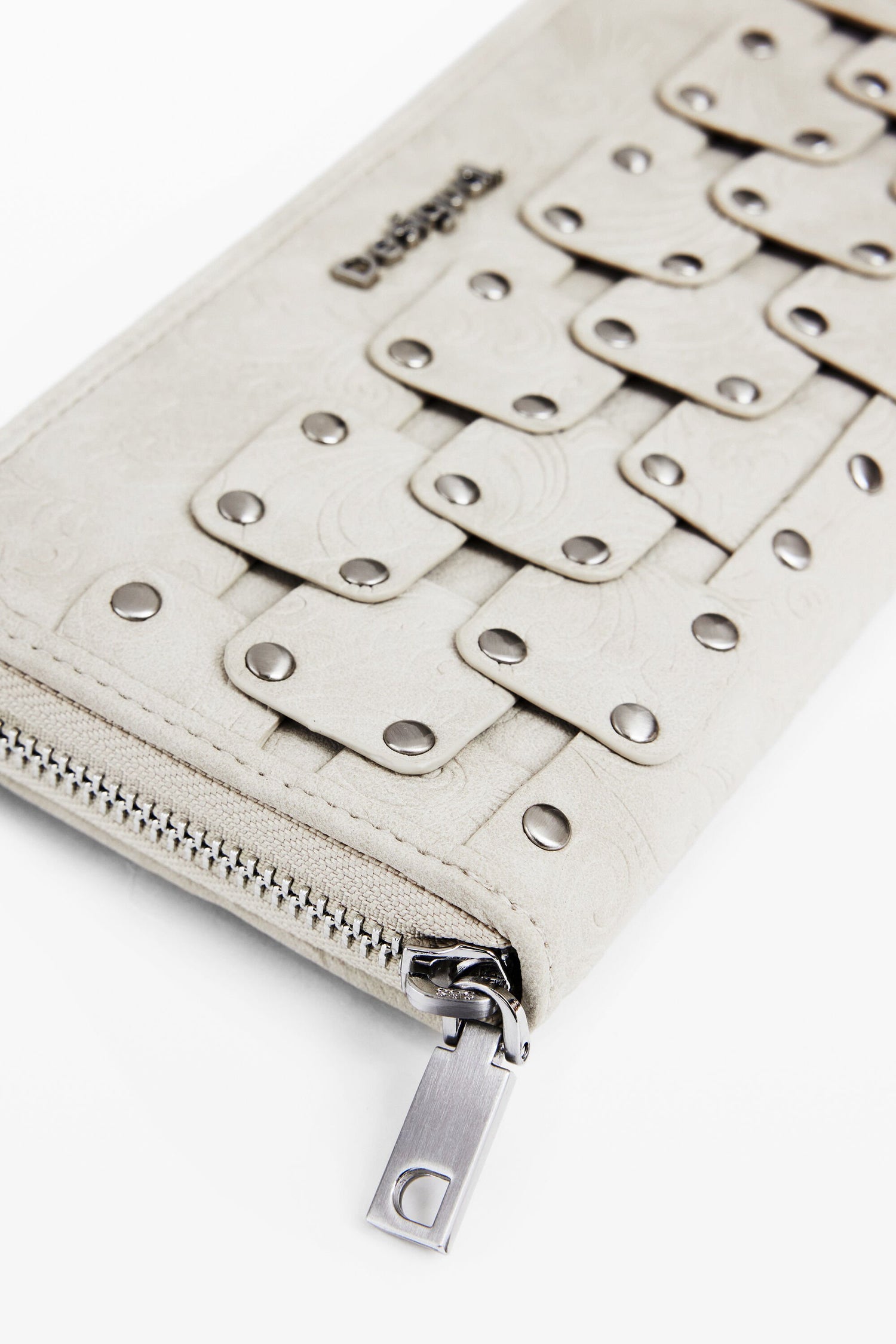 Large elongated wallet, in faux leather fabric, with studs and patchwork effect, zipper closure, and various interior compartments.