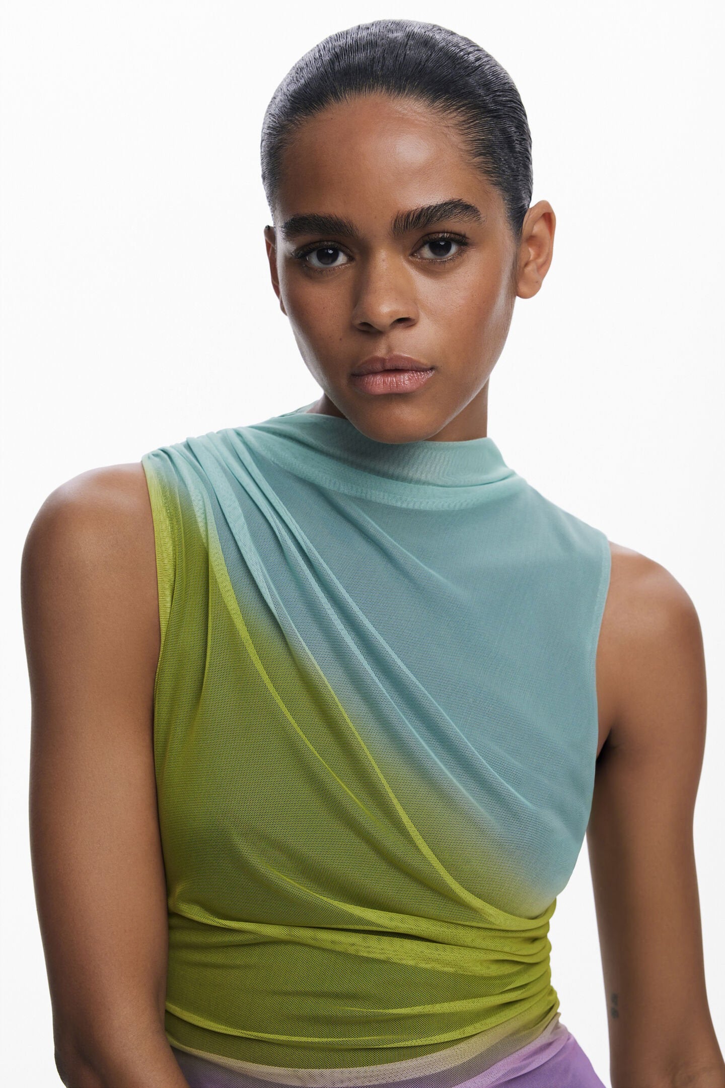 95% VISCOSE, 5% ELASTANE - Midi dress in tulle, sleeveless, round neck and front draping with color gradient.
