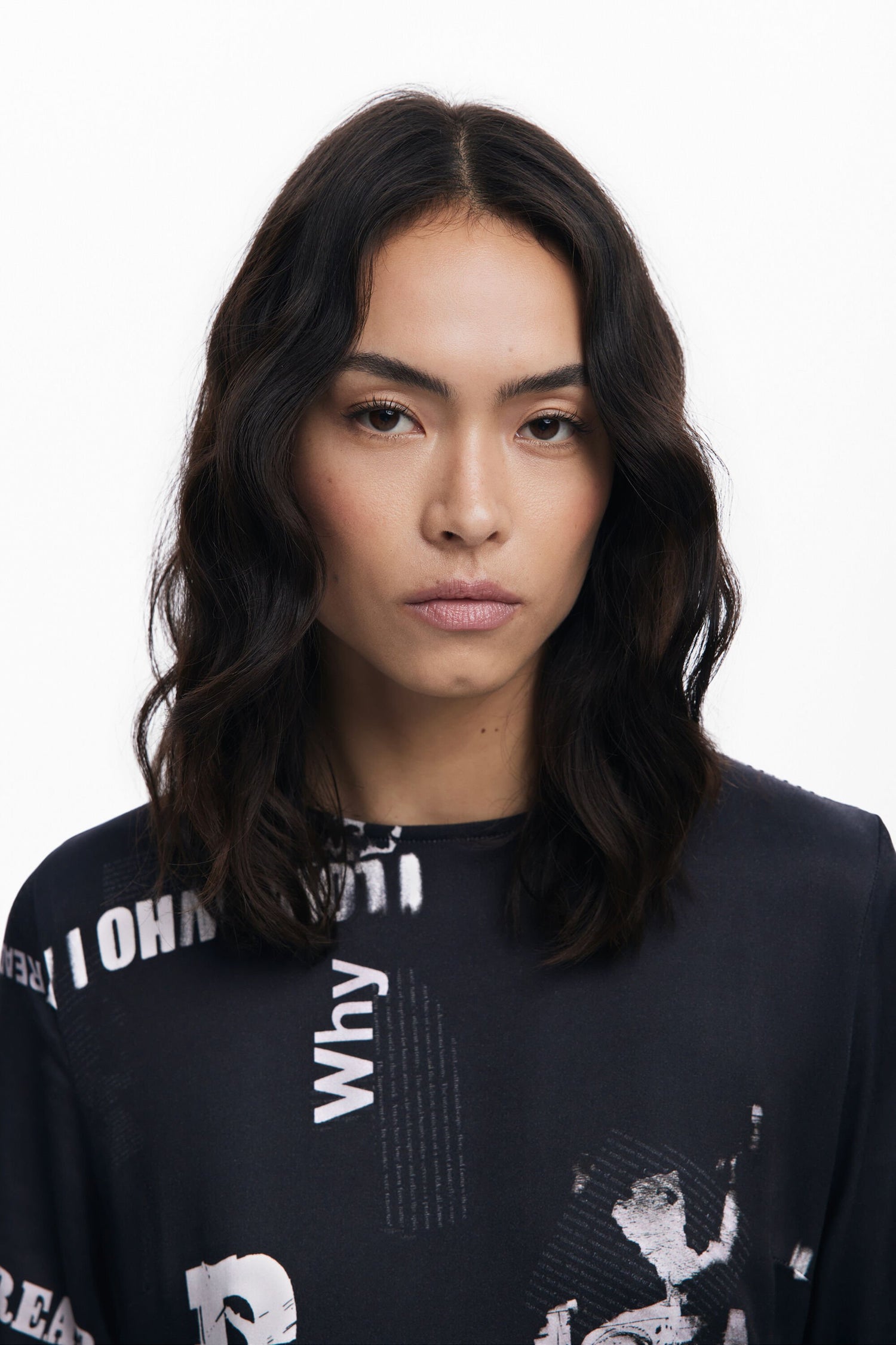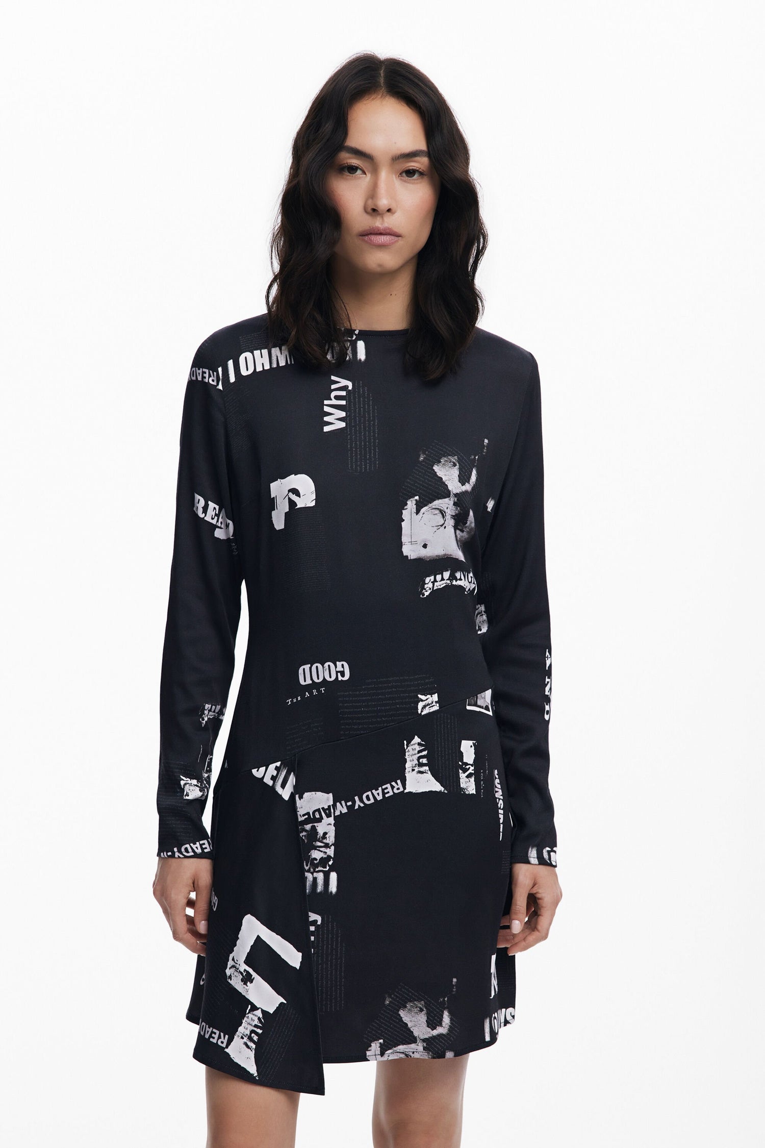 97% VISCOSE, 3% ELASTANE - Short fitted dress with asymmetrical hem, long sleeves, and round neck with newspaper print.
