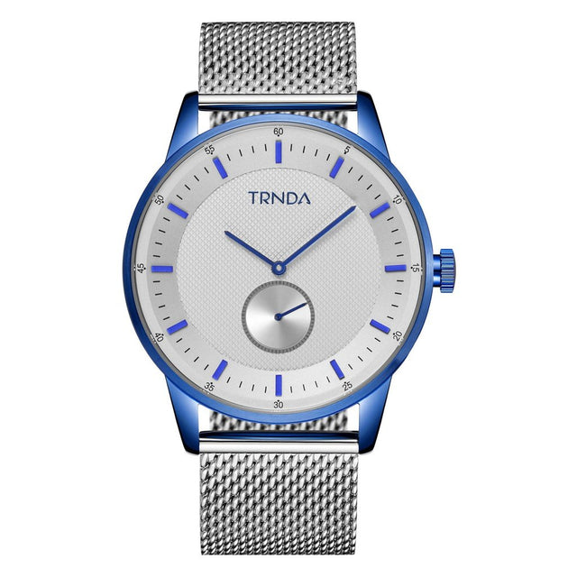 TRNDA STAINLESS STEEL MEN'S WATCH - BLUE PLATED ROUND CASE & SILVER MESH BAND
