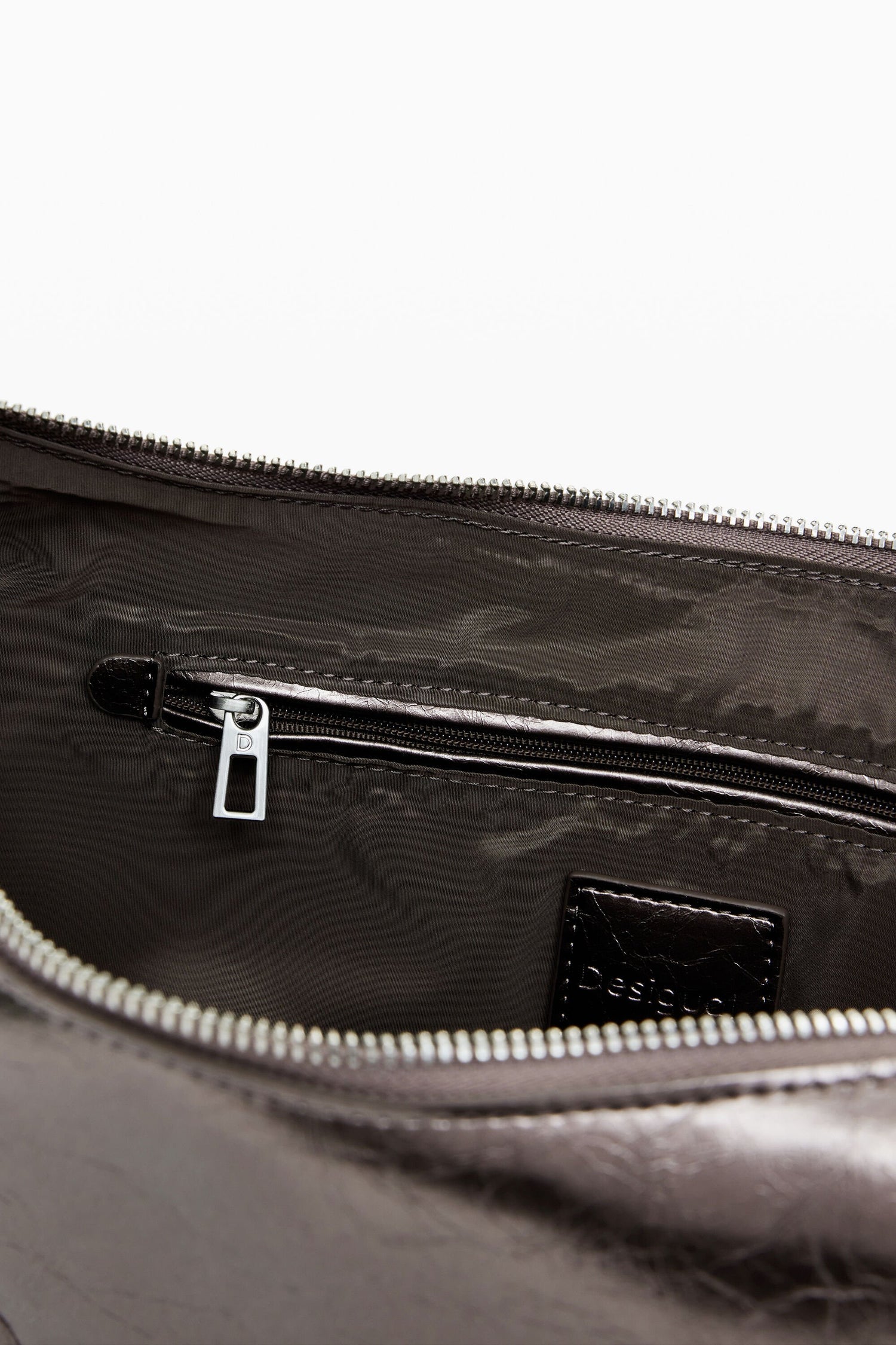 100% POLYURETHANE - Medium-sized crossbody style bag, in solid color faux leather fabric with metallic finish, 3D effect logo, interchangeable handles, and zipper closure.