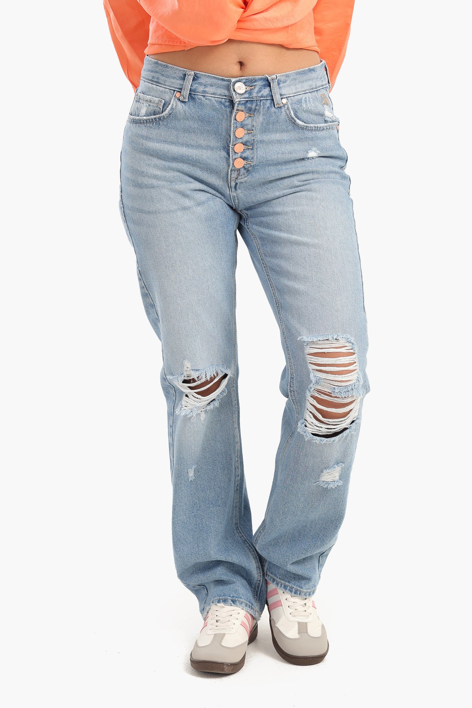هذا الجينز الممزق مثالي لإضافة لمسة عصرية إلى خزانة ملابسك. مصنوع من القطن الناعم، يتميز بقصّة عادية وقصّة مستقيمة لإطلالة أنيقة. تصميمه الممزق يمنحه مظهرًا عصريًا وباهتًا، بينما يوفر إغلاقه بأزرار ملاءمة كلاسيكية وآمنة. مع جيبين أماميين وجيبين خلفيين، يتميز هذا الجينز بتصميم عملي وأنيق. طوله الكامل وسهولة ارتدائه، يجعله إضافة متعددة الاستخدامات لإطلالاتك الكاجوال.
