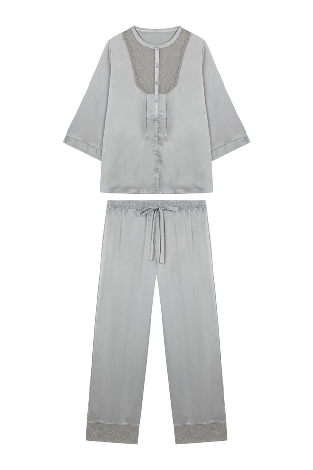 Shirt pajamas, with a long-sleeved shirt and trousers, made from crepe chiffon fabric with lace details, in bay green. Super soft and comfortable, you won't want to take it off all day. Perfect for this season!