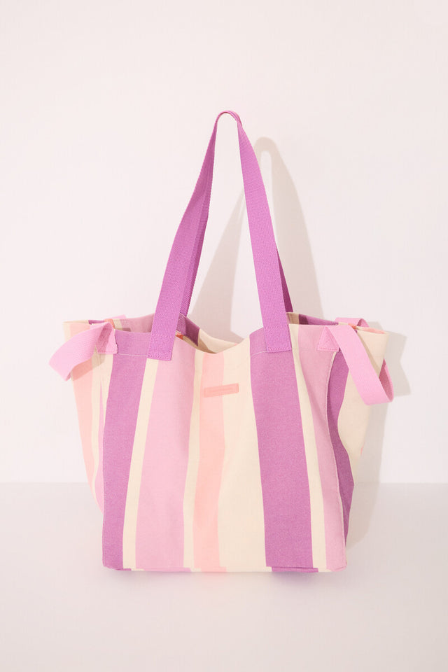 Large bag, bag made of canva (strong and resistant fabric that comes from canvas) with raffia handle detail, with stripe print in pink tones. - Very VERSATILE design, perfect to wear with your street, beach or pool looks. - Measurements: 42 cm x 50 cm x 17 cm. Ref. 3069503 Composition and care Composition 65% polyester, 22% cotton, 10% viscose, 3% modal Care Do not wash Do not bleach Do not tumble dry Do not iron Do not dry clean