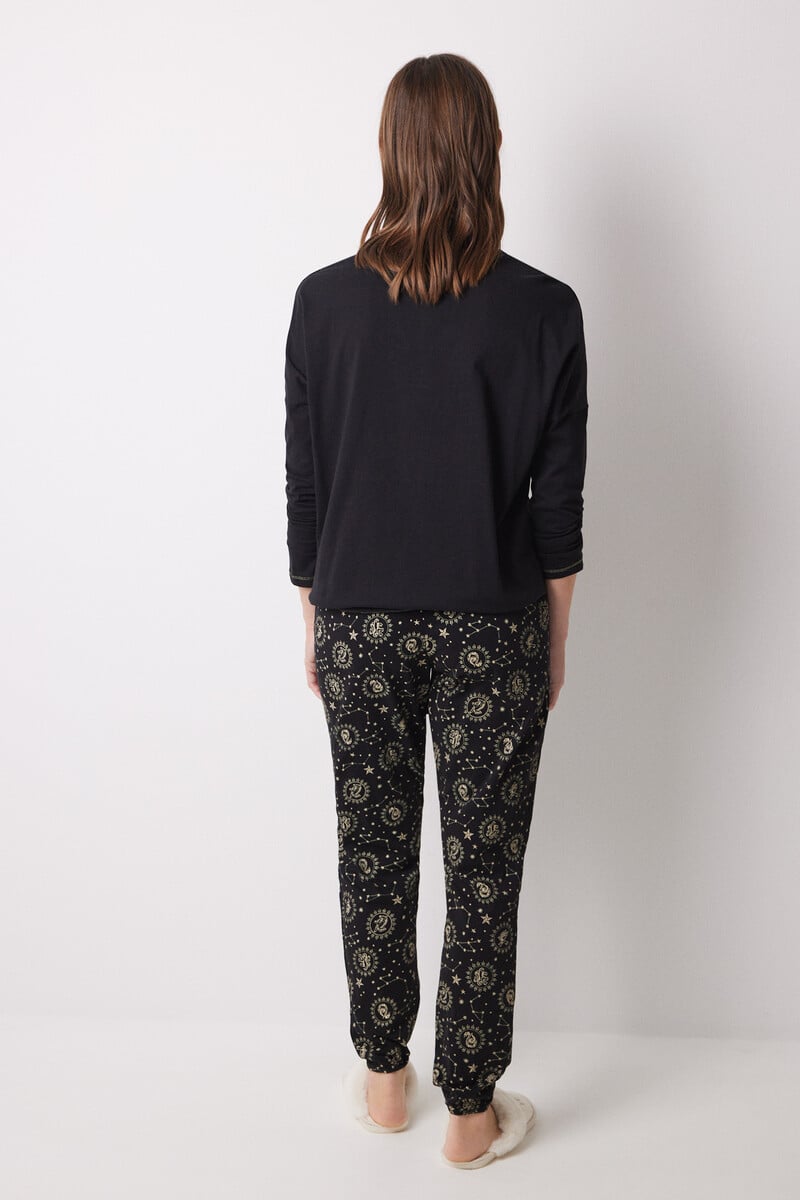 Long pyjamas, with a long-sleeved T-shirt and skinny trousers, made from 100% black cotton. Super soft and comfortable, you won't want to take them off all day. Perfect for this season!