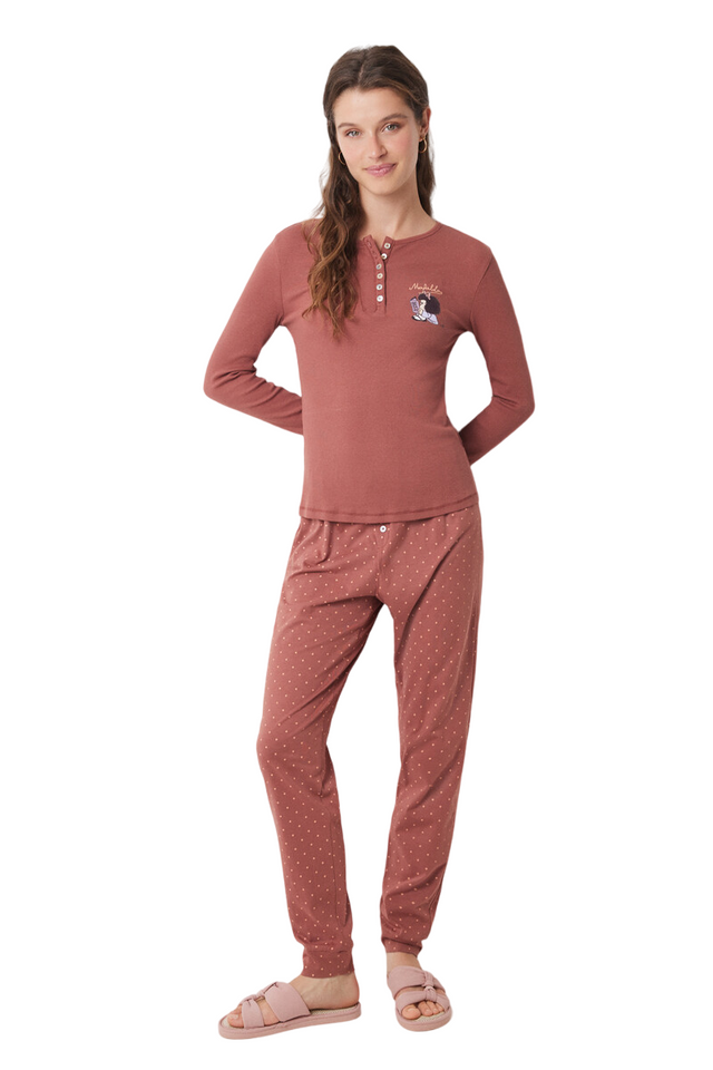 Long pajamas, made up of a long-sleeved T-shirt and skinny pants, made of cotton fabric, in brown. Super soft and comfortable, you won't want to take them off all day. Perfect for this season!