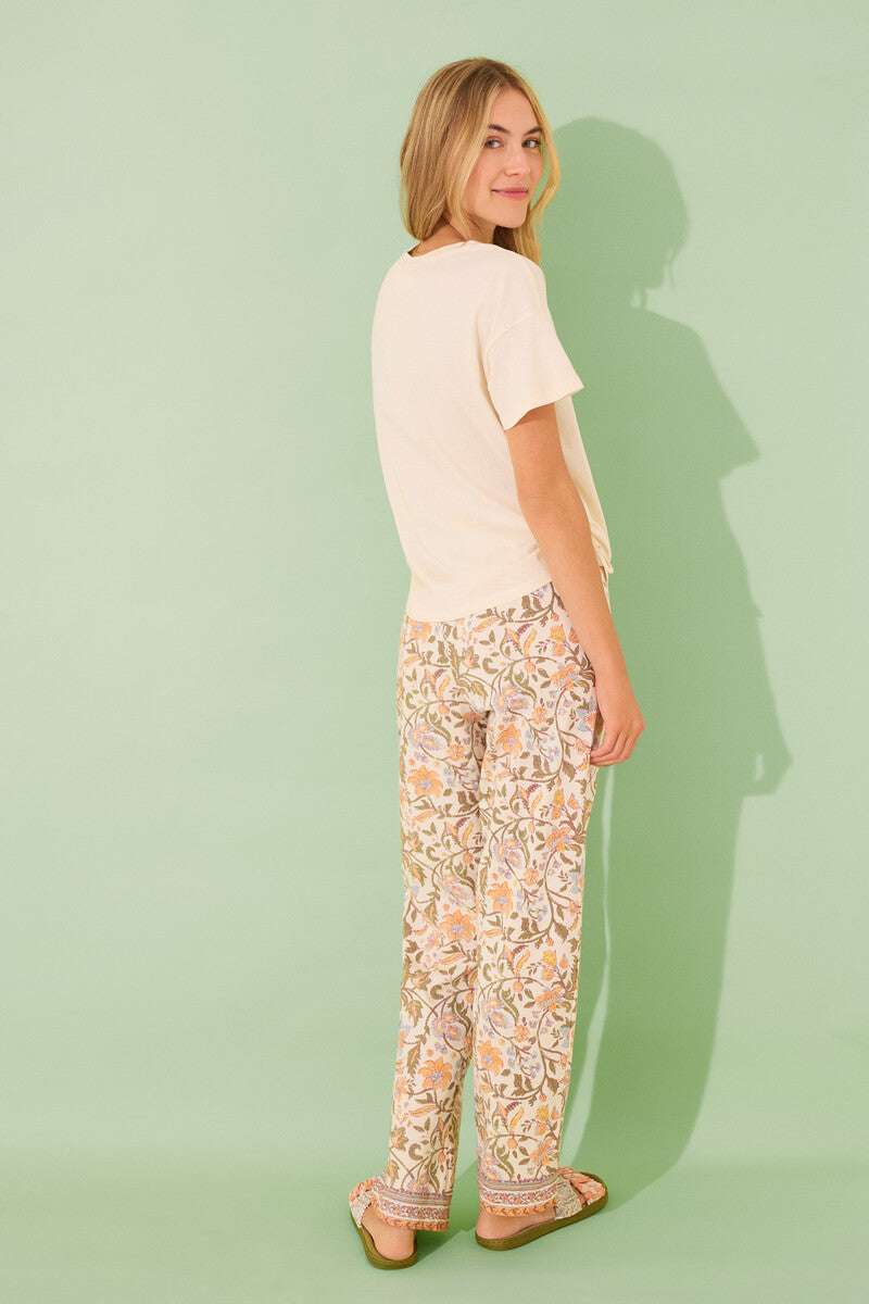 This short-sleeved pajama with long pants combines style and comfort for your most relaxing nights. The top has a round neck, front seams and gathered hems with drawstring. The long pants feature a floral print and an adjustable elastic waistband with a contrasting tassel drawstring. - Made of 100% cotton for softness and breathability. - Comfortable fit thanks to the adjustable elastic waistband. - By choosing our cotton products, you support our "Better Cotton" initiative. Model height: 177 cm. | She wears size S. Ref. 3139903 Composition and care Composition 100% cotton Care Maximum washing temperature 30C. Short spin Do not bleach Do not tumble dry Gentle ironing Do not dry clean