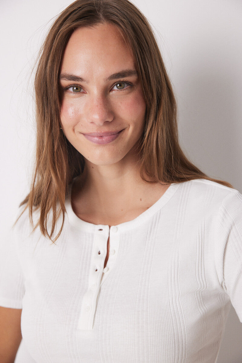 Short-sleeved T-shirt, in ribbed cotton fabric, plain in ivory. It's so practical and comfortable that you won't want to take it off all day long. Perfect for this season!