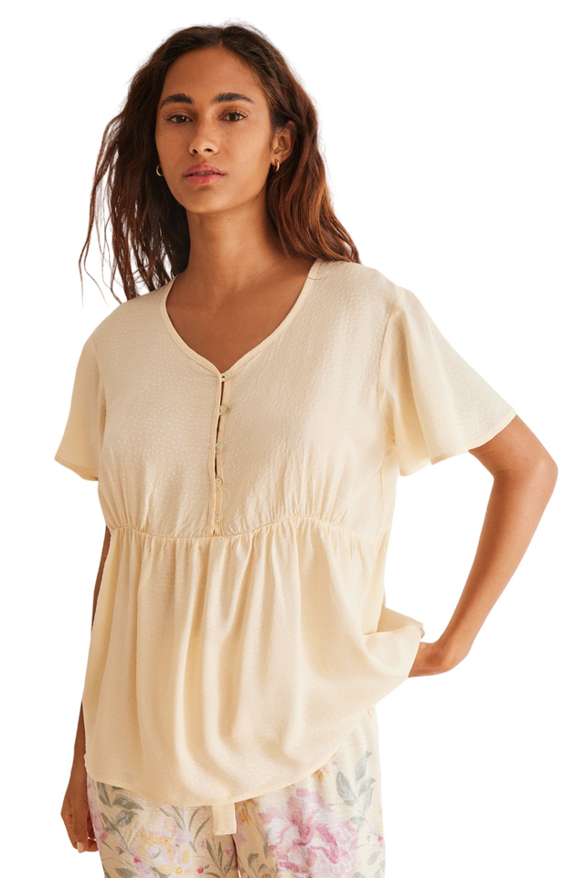 - Round neck top with button detail and seam below the chest with ruched detail.