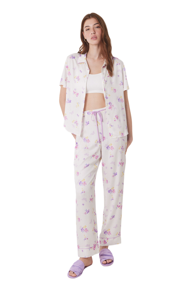 Shirt pyjamas, with a short-sleeved shirt and long trousers, made from soft-touch satin ECOVERO™ viscose fabric, in white with an all-over print of butterflies and flowers in shades of lilac and pink. Super soft and comfortable, you won't want to take it off all day long. Perfect for this season!