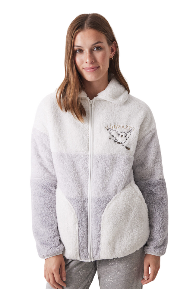 Short bathrobe in a colour-blocked fluffy fur fabric with lurex details. With Harry Potter embroidery on the chest. It is super warm and pleasant to the touch. Wear it with matching pyjamas from the collection, and keep your style at home too.