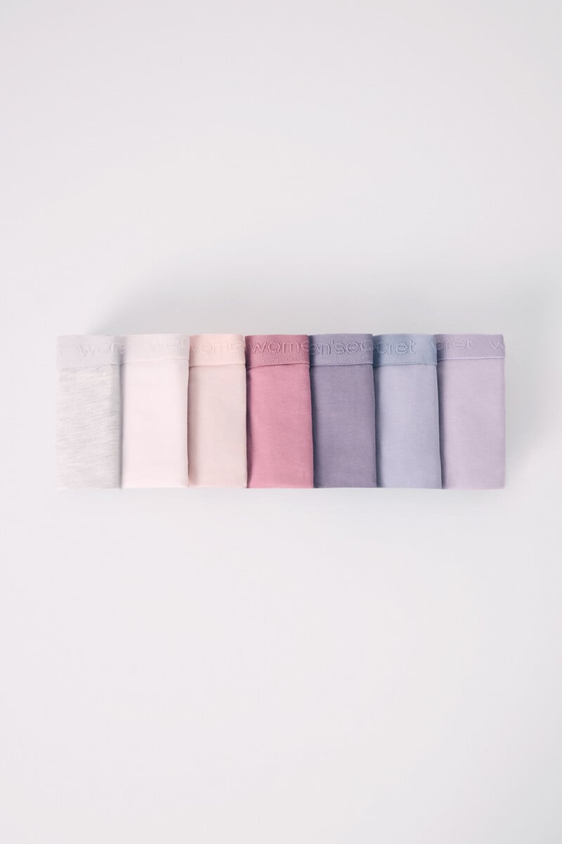 Pack of seven classic plain cotton panties in different shades of pink and lilac. They also have a 'Women'Secret' logo detail on the elastic waistband. A basic item that you should have in your underwear drawer.