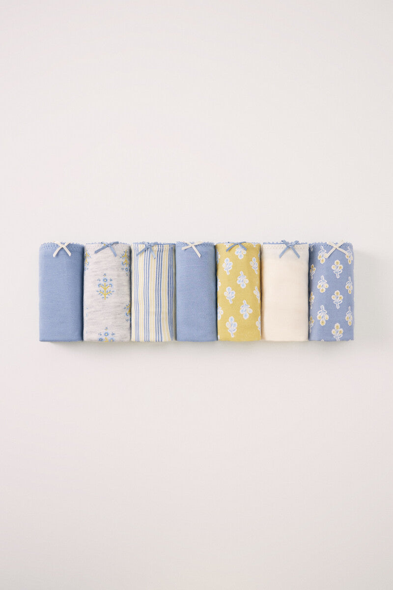 Pack of seven classic cotton panties in plain colours and with different prints in green and yellow tones. They also have a small bow on the front as an original touch. They are ideal, right?