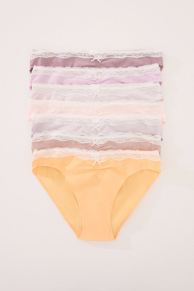 Pack of 7 classic cotton panties with lace, gathers and bow or bow details. In 7 different shades, perfect for the whole week. Combine them with the top you like the most to show off the complete outfit. - Exchanges or returns are only accepted with seal or on defective or flawed products. She wears size S. Ref. 4939014 Composition and care Composition 95% cotton, 5% elastane Care Hand wash Do not bleach Dry Lying Gentle ironing Do not dry clean