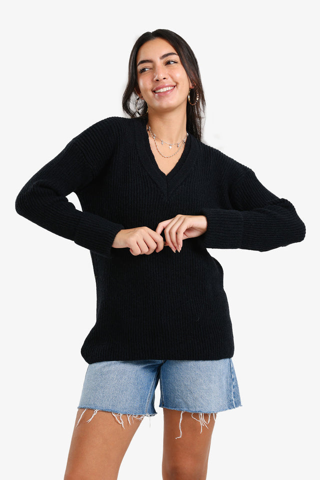 Carina - Ribbed V-Neck Pullover - Black / XXL تم طلبه مسبقًا وسيتم شحنه بمجرد عودته إلى المخزون.