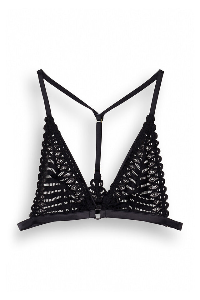 NATURAL triangle bra, without underwire or padding, with adjustable thin straps for those who love comfort without losing style. Made with black geometric lace. Sensational and comfortable! Combine it with its matching bottom.