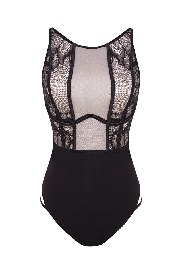 Halter bodysuit made of lace and microfibre, with underwire for better support, and transparent mesh detail on the neckline. Back with special opening and gathering on the side of the waist. In elegant black, it gives a super sexy touch to your look.