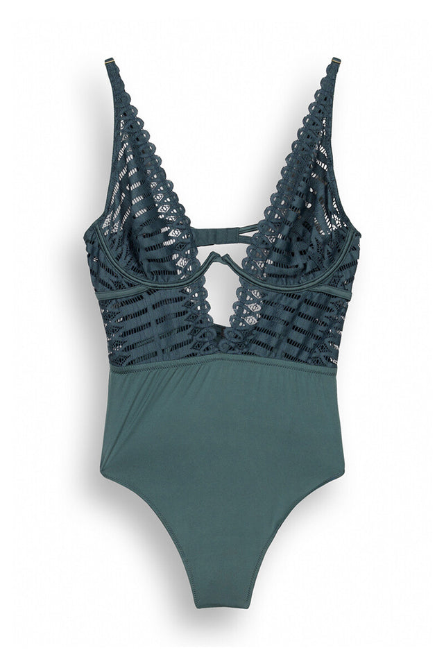Body made of lace and microfibre, with underwire for better support, and satin details. Back with special opening and adjustable straps. In elegant dark green, it gives a super sexy touch to your look.