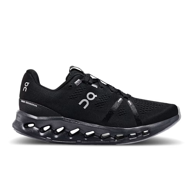 زوج من الأحذية الرياضية ذات الرقبة المنخفضة. يظهر أحد الحذاءين في وضع مستقيم، كاشفًا عن جزء علوي داكن اللون ذي ملمس مميز، مع شعار جانبي دقيق ونظام رباط فريد من نوعه يتميز بحلقات رفيعة. أما السمة الأبرز فهي النعل السميك الذي يتميز بوجود تجاويف أو نتوءات صغيرة مجوفة على طول النعل الخارجي بلون أفتح متباين.