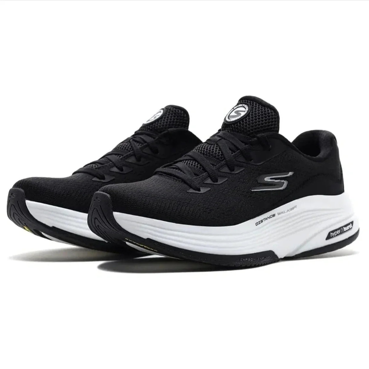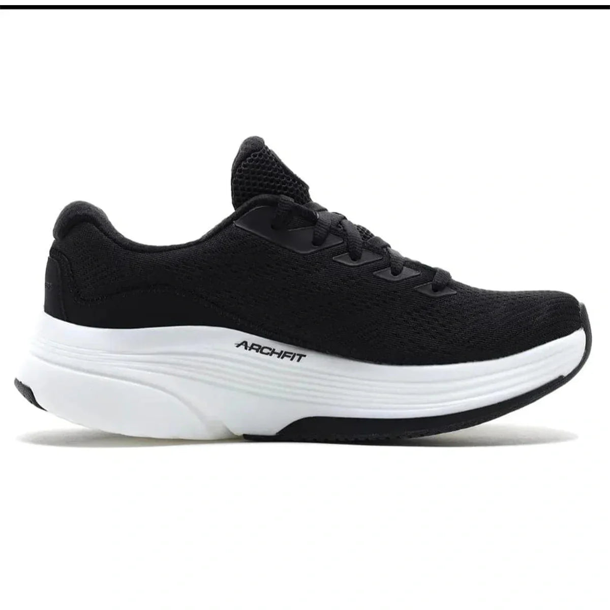 This athletic shoe features a mesh upper with supportive overlays and a traditional lacing system. It has a significantly thick, sculpted sole with a curved profile, indicating cushioning for walking or running. The overall design is sleek and performance-oriented.
